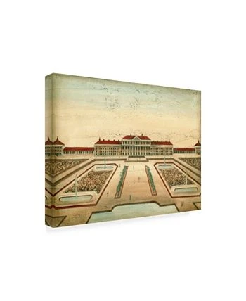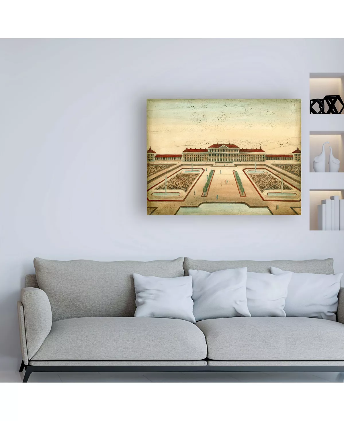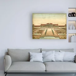This ready to hang, gallery-wrapped art piece features a large building in the distance after a vast garden. Gallery-wrap is a method of wrapping an artist’s canvas around a hidden, wooden frame allowing for a frameless presentation.