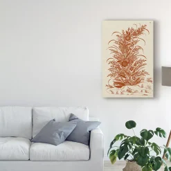 This ready to hang, gallery-wrapped art piece features an orange illustrated plant in the center of the frame. Gallery-wrap is a method of wrapping an artist’s canvas around a hidden, wooden frame allowing for a frameless presentation.