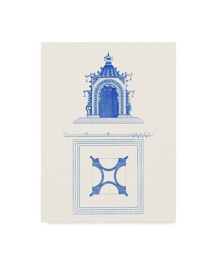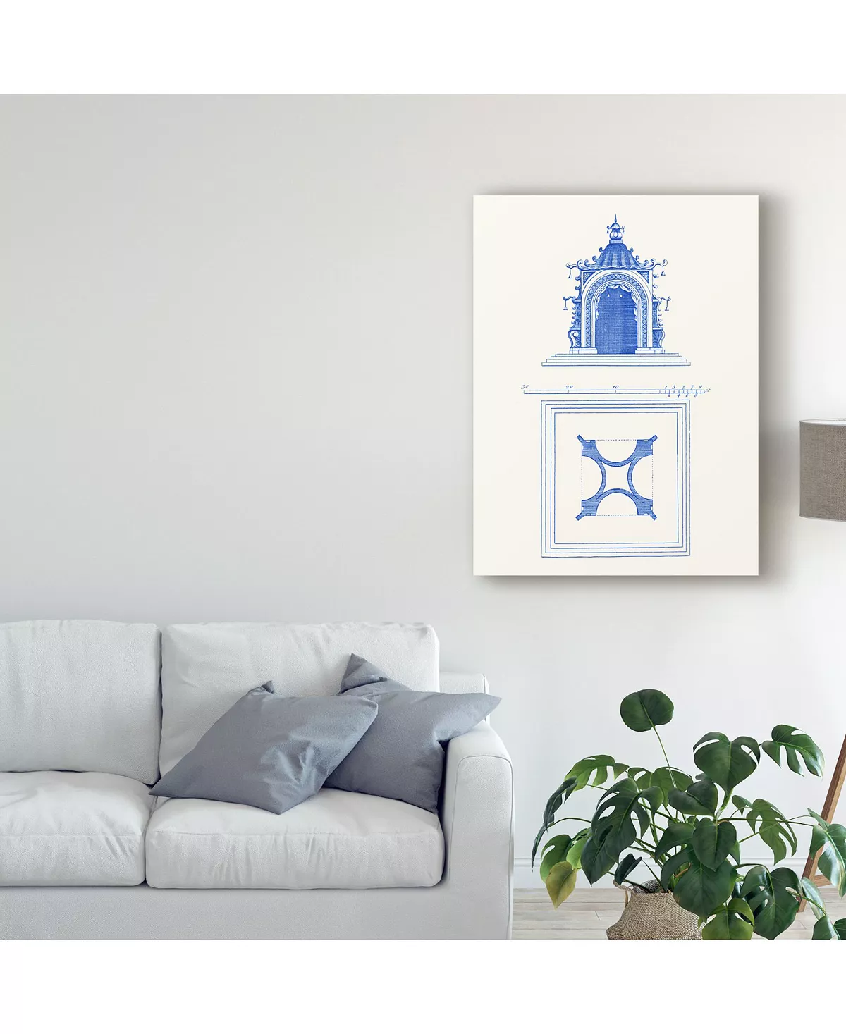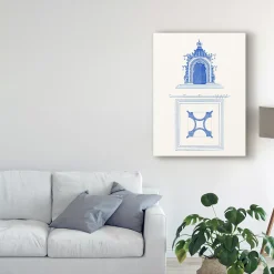 This ready to hang, gallery-wrapped art piece features a blue illustrated building in the center of the frame. Gallery-wrap is a method of wrapping an artist’s canvas around a hidden, wooden frame allowing for a frameless presentation.