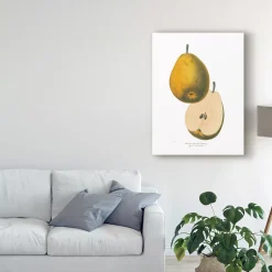 This ready to hang, gallery-wrapped art piece features a vintage botanical illustration of a halved, golden pear. Gallery-wrap is a method of wrapping an artist’s canvas around a hidden, wooden frame allowing for a frameless presentation.