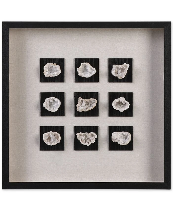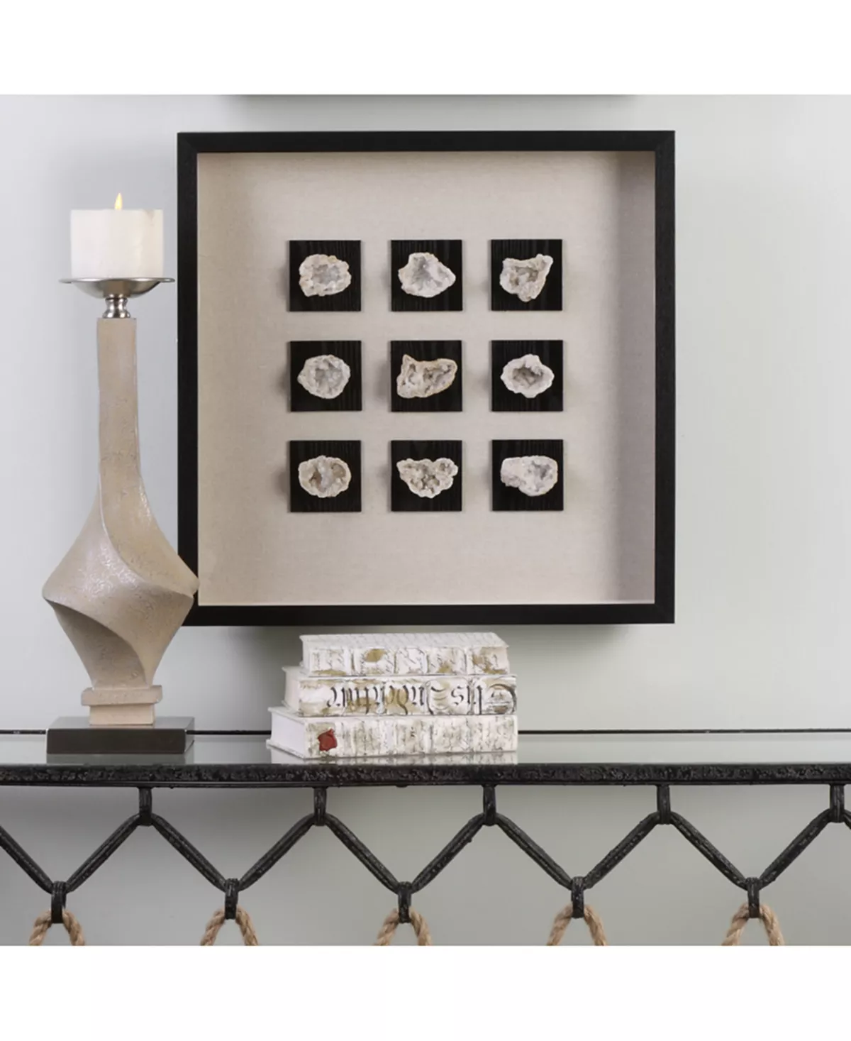 The textured asymmetry of crystalline stones handsomely aligns in Uttermost’s Geode wall art with a neutral-colored linen backing and black wood accents.