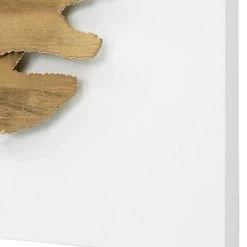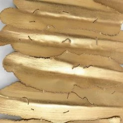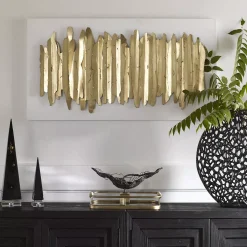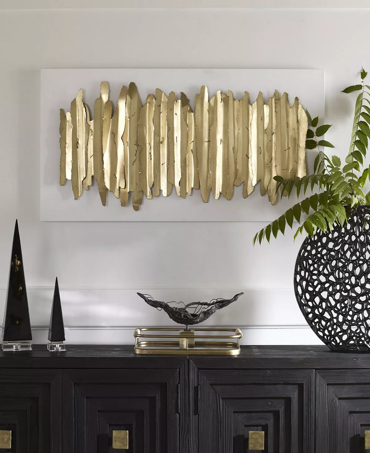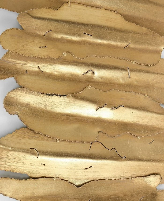 Iron wall art featuring layers of metal strips with crude edging, finished in an antique gold-tone leaf and set on a matte white iron backing. May be hung horizontal or vertical.